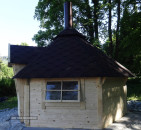 Drevený grilovací domček DG 1 je postavený z najkvalitnejších masívnych smrekových kmeňov s hrúbkou 45 mm. Podlaha má hrúbku 32 mm a navyše je domček od zeme oddelený masívnymi drevenými trámami, vďaka ktorým je konštrukcia veľmi stabilná a odolná. Domček bol navrhnutý na šesťuholníkovom pôdoryse so šesťvalcovou strechou s hrúbkou 15 mm. Súprava obsahuje veľký gril s grilovacími plošinami, so spodným vetraním a odkvapkávačom s komínom s nastaviteľnou výškou. Pri stenách je päť veľkých lavíc, ktoré ľahko pojmú 15 osôb. Interiér domčeka pozostáva z jednej miestnosti s rozlohou približne 9,3 m2. Centrálne umiestnený gril s dvoma roštmi a nastaviteľným odkvapkávačom je obklopený stolom a piatimi veľkými a pohodlnými lavicami. V prednej časti domčeka sa nachádzajú jednokrídlové, čiastočne presklené vstupné dvere. Konštrukcia má tri veľké okná vyrobené kompozitnou technológiou (vďaka dvojitému zaskleniu poskytujú vynikajúcu tepelnú izoláciu), z ktorých jedno je výklopné. Vďaka konštrukcii bude grilovací domček dobre fungovať v lete aj v zime. Na domček sa vzťahuje 24-mesačná záruka.