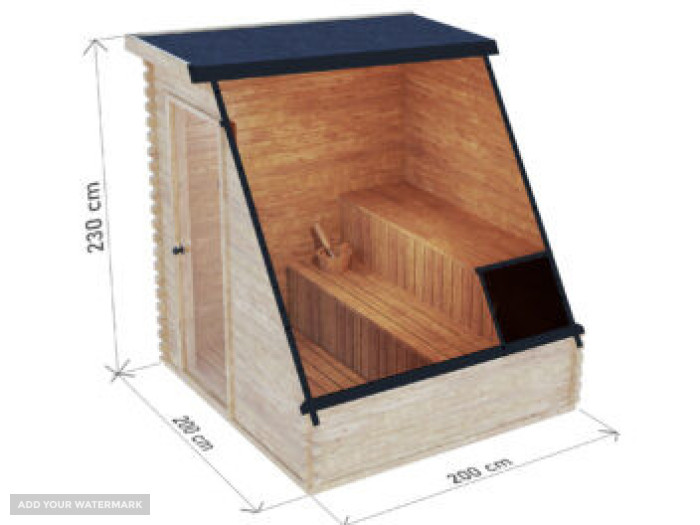 Sauna štvorcová, pec na drevo 16,5 kW, osvetlenie pod lavicami, bezfarebná impregnácia.