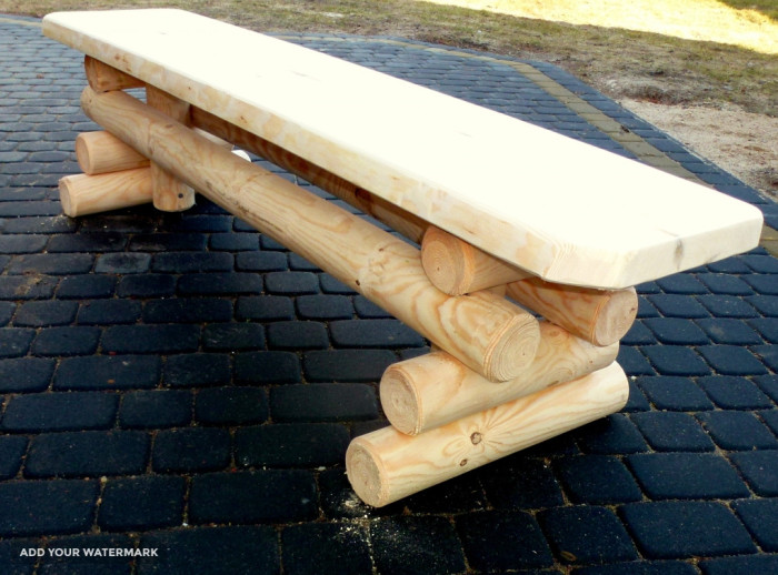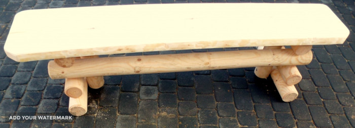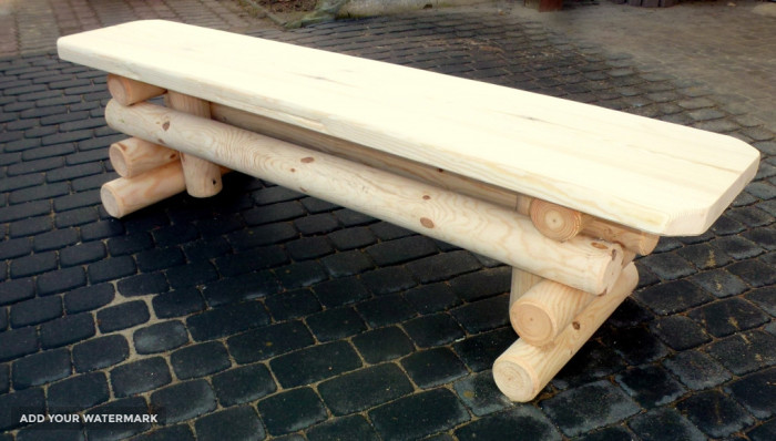 Lavička k táboráku. Priemer polena 10 cm; – doska hrubá 5 cm, dĺžka 180 cm
